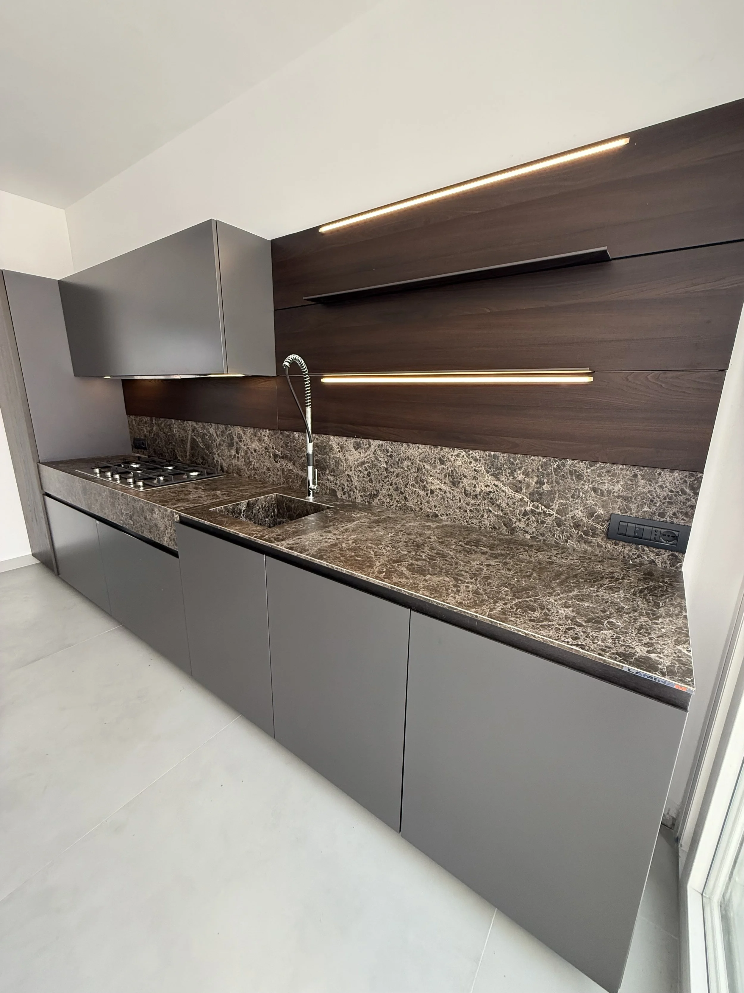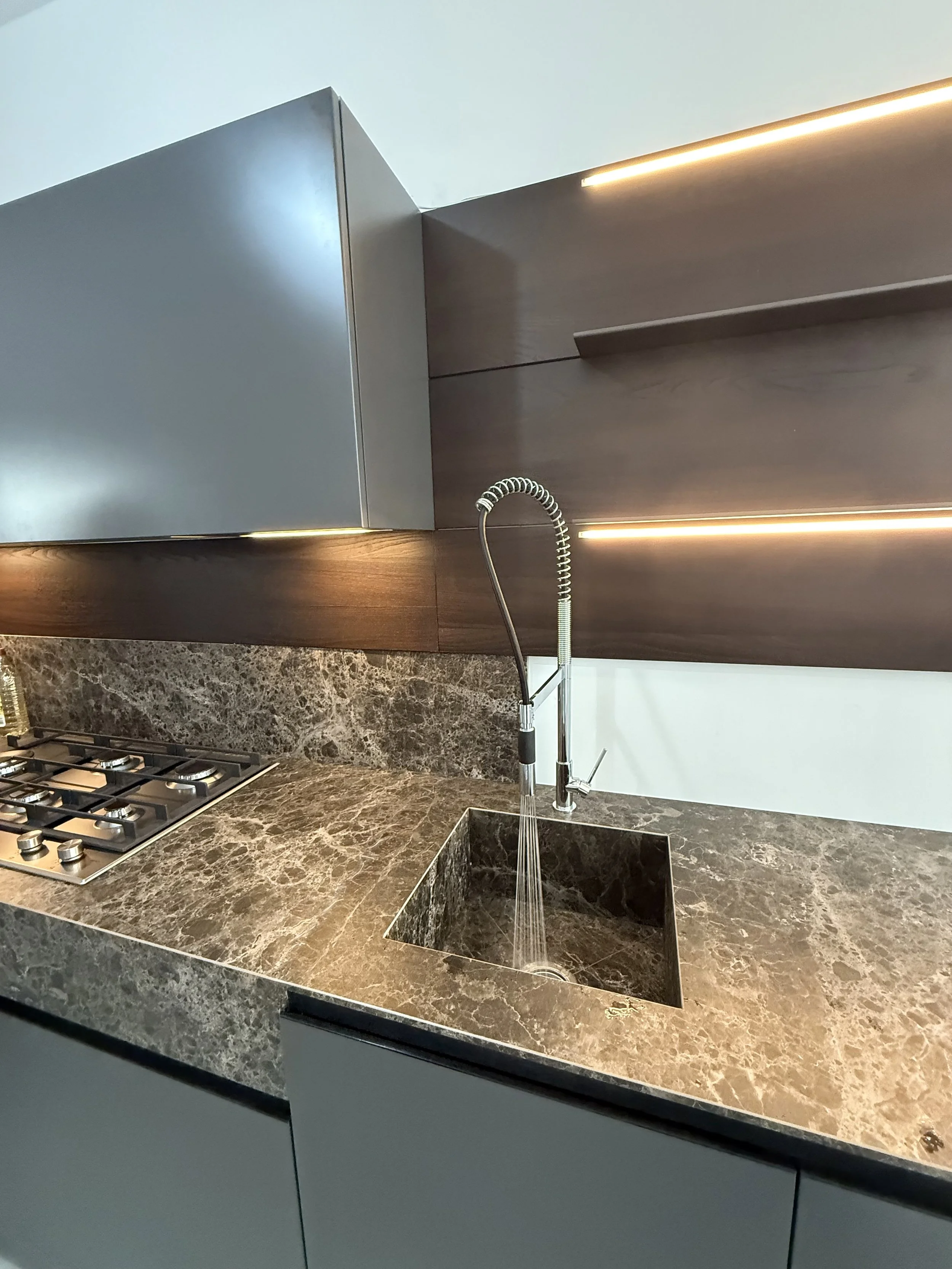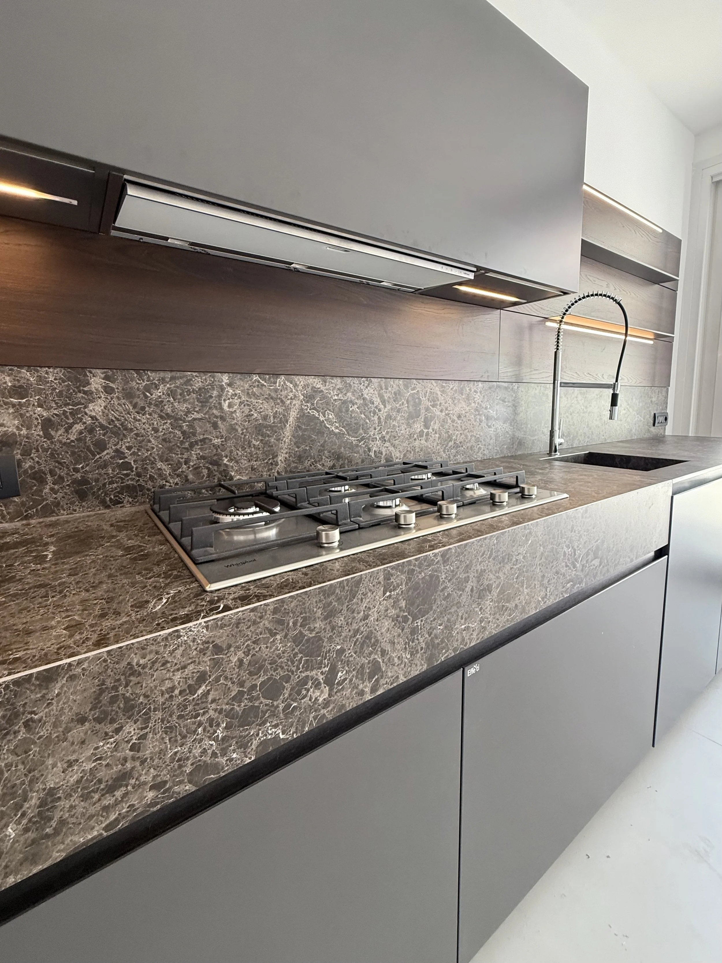 La cucina Effe Ti proposta in questa configurazione è pensata per rispondere alle esigenze di progettazione contemporanea, con particolare attenzione a materiali performanti, modularità e coerenza estetica.